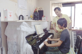 個々のレッスン(30分位)で現在練習している曲を勉強いたします。御覧のようにお茶をのみながらゆったりムードでの雰囲気で行っております。
